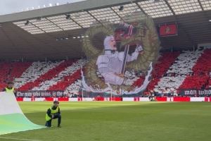 体育资讯8月16日讯 桑德兰回归英超后迎来首战,与西汉姆的比赛正在进行当中,黑猫球迷们打出巨幅TIFO,给球队打气。