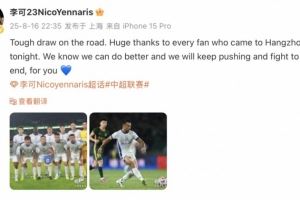 客场战平,结果艰难。衷心感谢今晚来到杭州的每一位球迷。我们知道我们可以做得更好,我们将继续拼搏,为你们战斗到最后一刻。