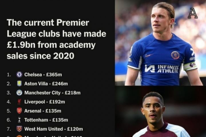 英超20队青训球员出售榜:切尔西3.65亿断档第1,红军第4&曼联第8