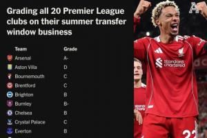 体育资讯09月03日讯 25/26赛季夏窗关闭,TA为英超20队今夏的转会操作评级,利物浦A,阿森纳A-,切尔西、曼联和热刺B,曼城B-。