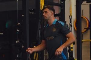 马丁内斯在室内训练间隙跳舞,似乎在琢磨新的庆祝舞步,阿根廷队社媒晒出视频,配文:“认真训练又乐在其中。”